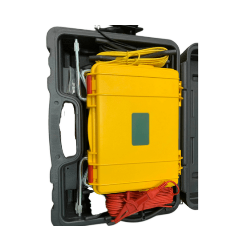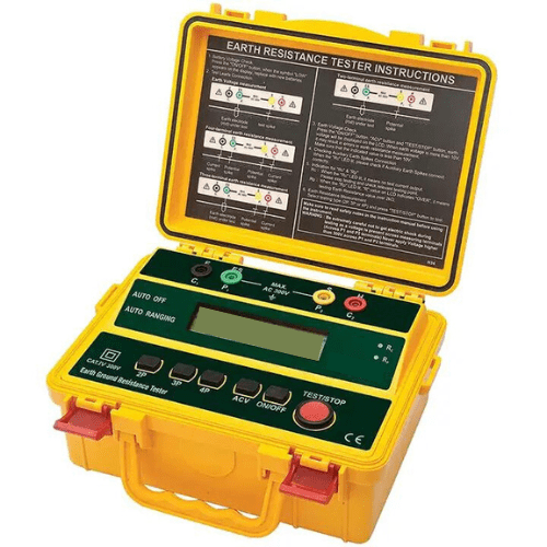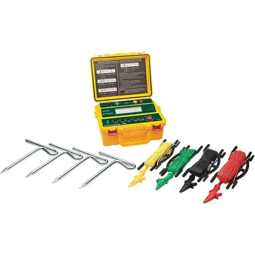 Measure earth ground in 4 ranges from 2 Ohm to 2000 Ohm. 4-wire, 3-wire, and 2-wire testing. Large dual line LCD. Automatic I (current) and P (potential) spike check. Test Hold function for easy operation. Auto ranging, Automatic Zero adjustment, Data Hold and Auto Power off. AC Earth Voltage. Over range and low battery indication. Complete with test leads with alligator clips, 4 auxiliary earth bars, hard carrying case, and eight 1.5 V AA batteries.
