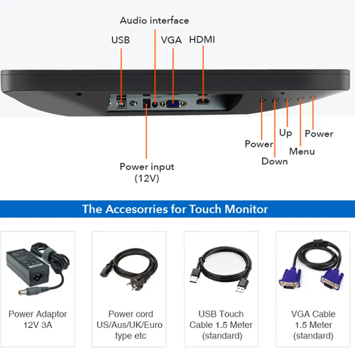 | Interface | VGA input, USB for touch, HD-MI available |